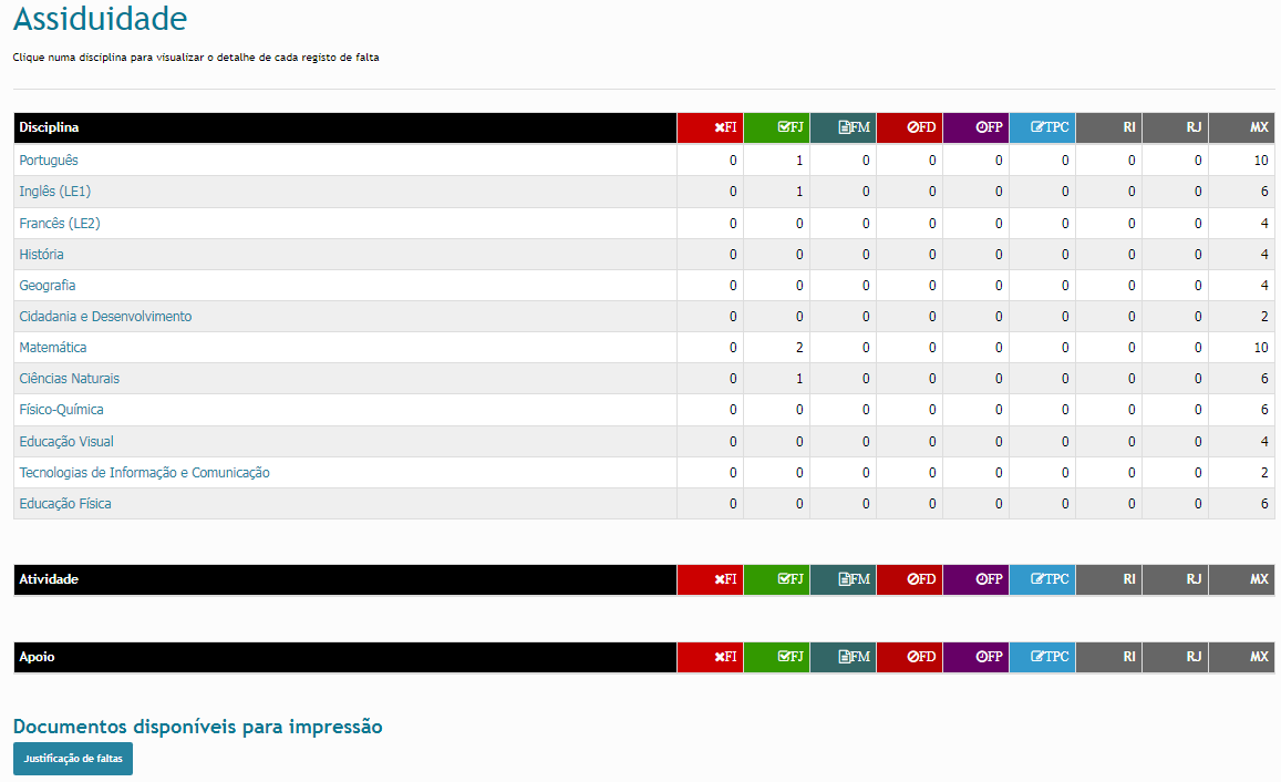 Na Assiduidade, o Encarregado de Educação tem acesso à assiduidade do aluno por disciplinas. Clicando em cada disciplina tem acesso aos detalhes de cada falta. (FI - Falta Injustificada; FJ - Falta Justificada; FM - Falta de Material; FD - Falta Disciplinar; TPC - Falta de cumprimento do TPC; RI - Resumo das faltas injustificadas; RJ - Resumo das faltas justificadas; MX - Máximo de Faltas permitidas por Disciplina). Na parte inferior terá acesso às faltas, caso o aluno esteja inscrito,das Atividades e Apoios.