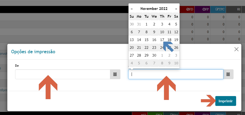 Clicando nas caixas De e Até abrirão caixas de calendário onde o E.E. deverá clicar nos dias do calendário em que pretende justificar as faltas. Caso as faltas do aluno não sejam seguidas em termos de dias - Ex: o aluno faltou no dia 1/10, veio às aulas no dia 2/10 e faltou outra vez no dia 3/10 - o E.E. deverá fazer o processo por dias - um processo para o dia 1/10 (De 1/10 Até 1/10) e outro para o dia 3/10 (De 3/10 Até 3/10). Após selecionar as datas que pretende justificar o E.E. deverá clicar no "Imprimir". Será gerado um documento PDF, com as disciplinas em que o aluno teve faltas assinaladas nas datas escolhidas. O E.E. deverá imprimir o documento, justificar a falta no campo respetivo (à frente da Disciplina), assinar/datar o documento e fazer chegar este ao DT.