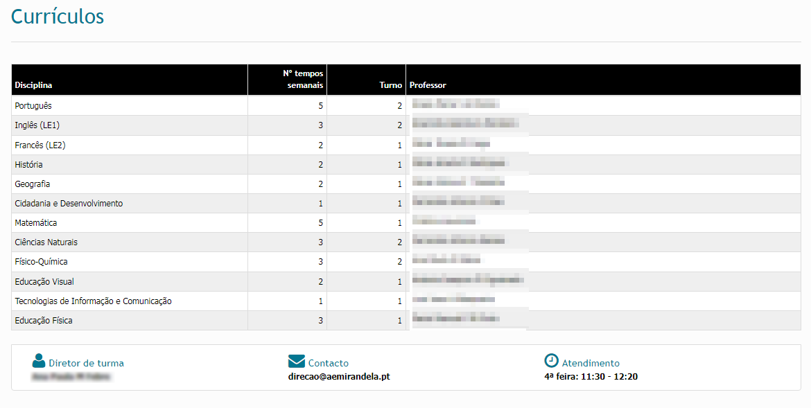 Nos Currículos, o Encarregado de Educação tem acesso às disciplinas do aluno; os seus tempos semanais, se tem turnos e o horário de atendimento aos E.E. pelo diretor de turma.